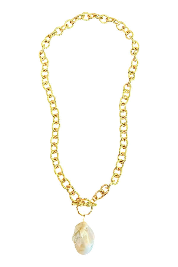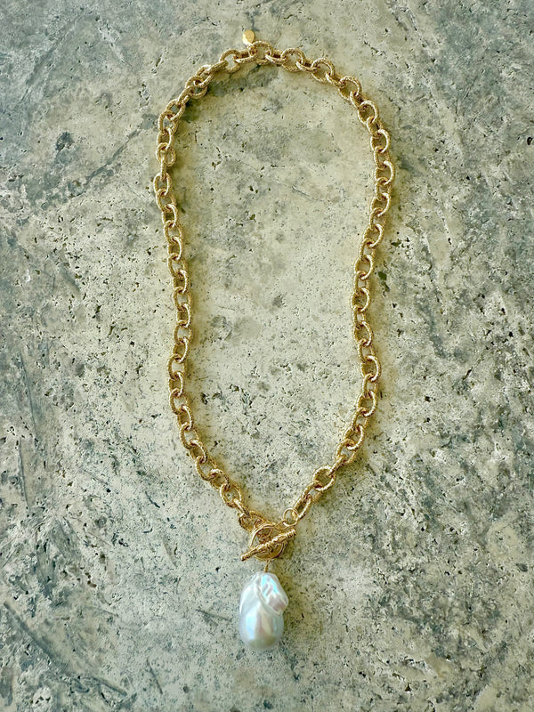 Baroque pearl on gold textured hammered chain & toggle, 18".  Pearls signify innocence and promotes purity and truth.