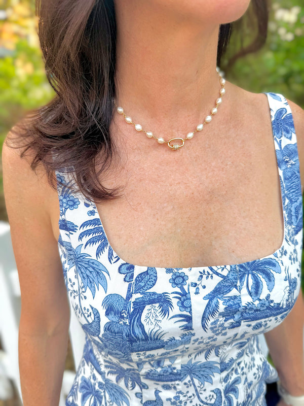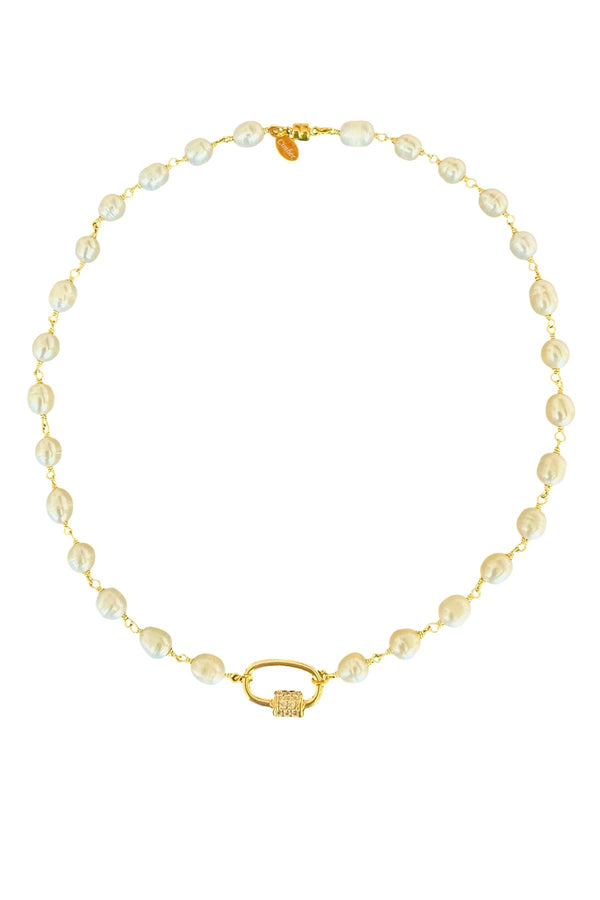 CZ carabiner center of freshwater pearl vermeil chain, 16" with magnetic closure.  Pearls signify innocence and promotes purity and truth.