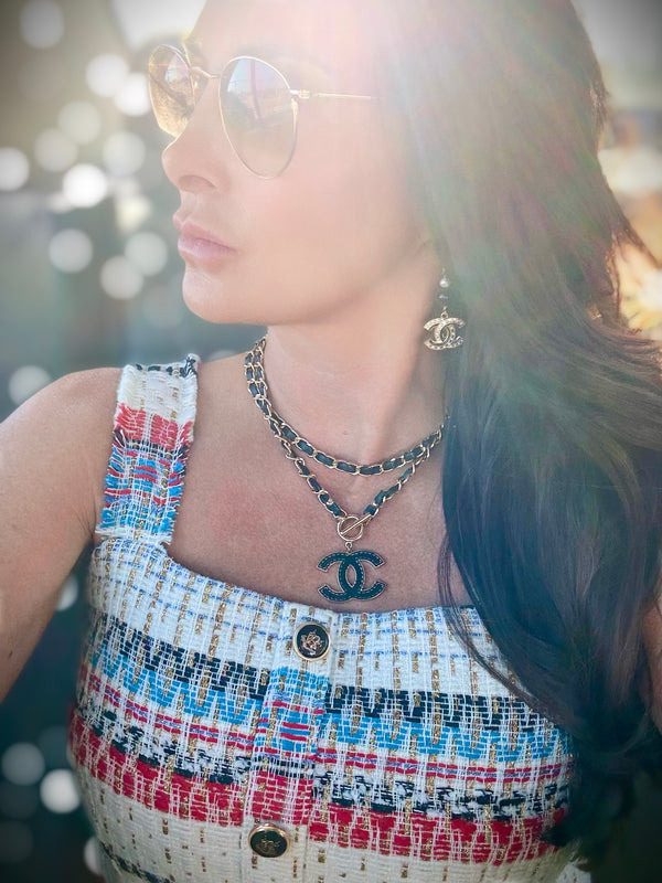 Chanel leather charm pendant, 1.5"wide, on mixed leather and metal chain, 34". Wear it long or double wrap it.  Some are one of a kinds or limited editions. 100% authentic...