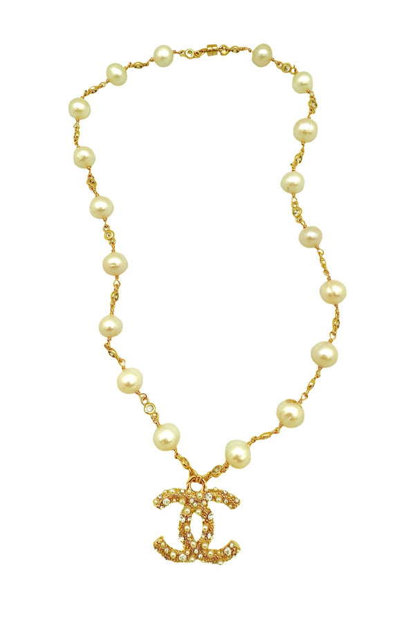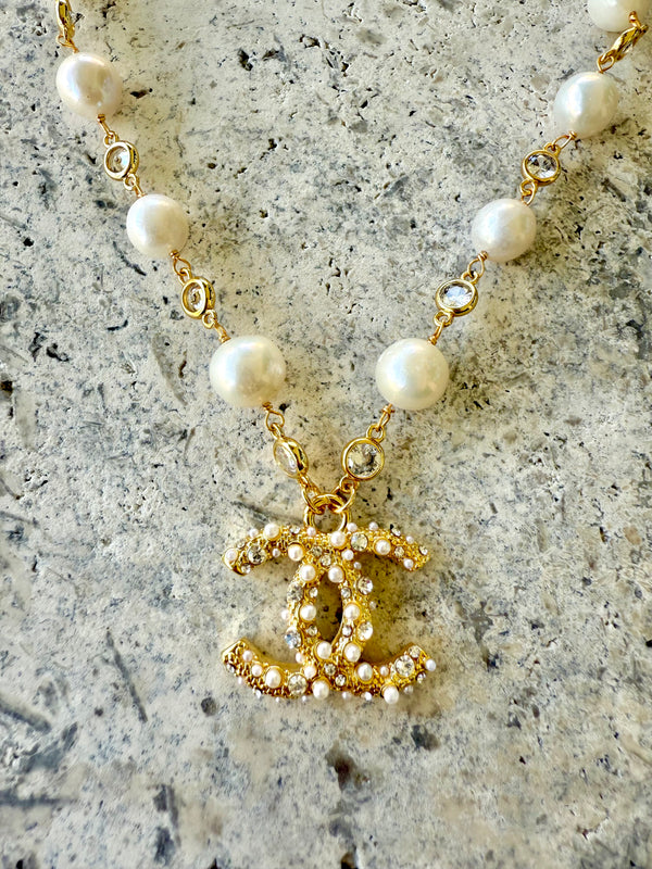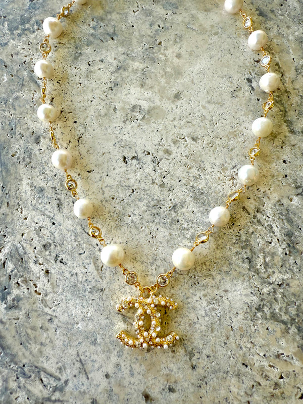 CC pearl and cz charm on 18" large pearl and cz chain with magnetic closure.  Some are one of a kinds or limited editions. 100% authentic charms, repurposed into necklaces....