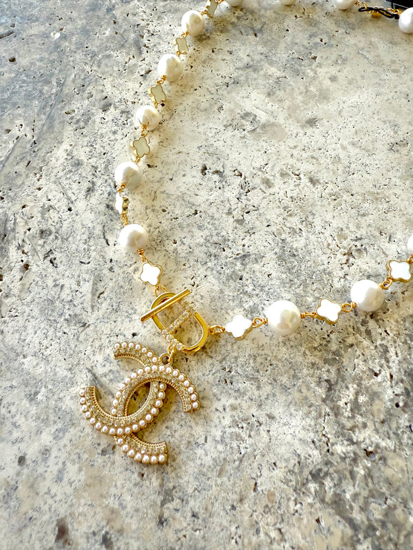 CC pearl charm on 18" large pearl and white clover chain with cz toggle closure in the front.  Some are one of a kinds or limited editions. 100% authentic charms,...