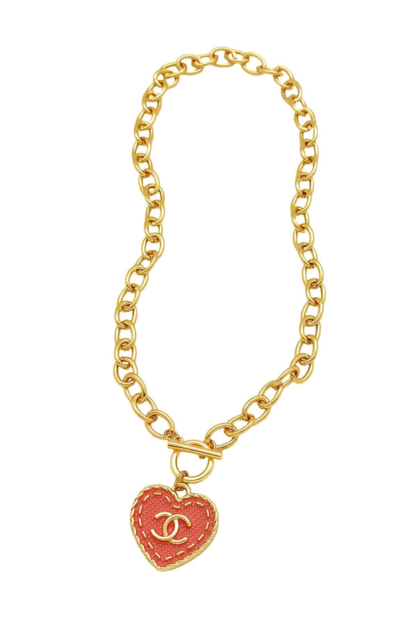 Pink chanel heart, 30mm wide on 18" gold link chain and toggle. Chain is 18kt triple plated with a protective coating making it tarnish resistant and high quality.  Designer buttons...