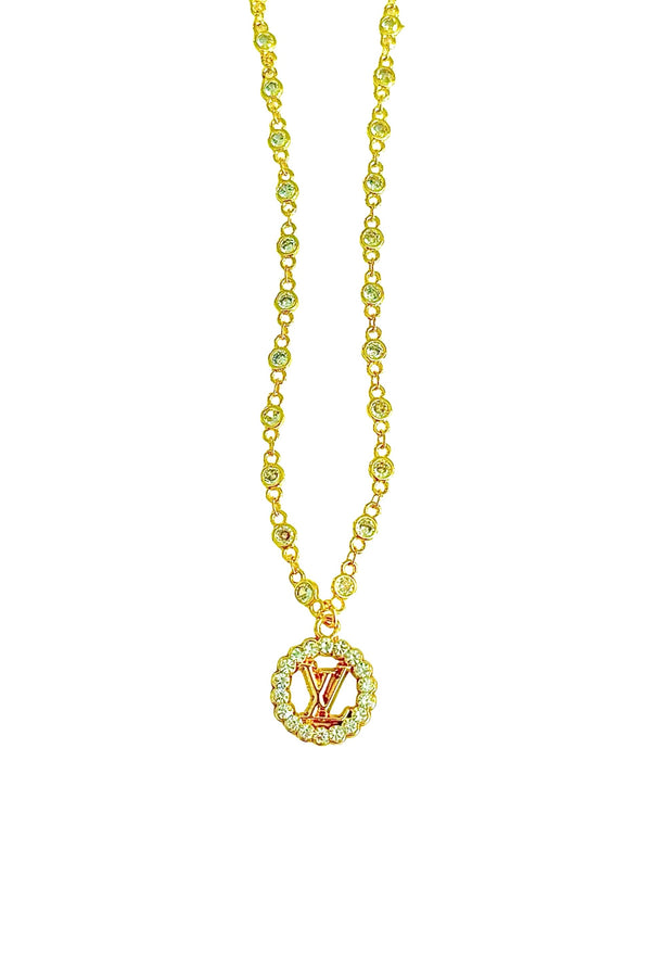 Crystalized LV round charm on 17" cz gold chain with magnetic closure and tarnish resistant e-coating. Some are one of a kinds or limited editions. Authentic designer charms, repurposed into...