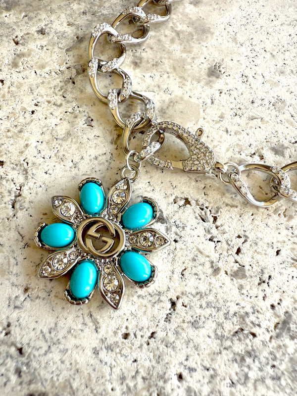 Silver Turquoise GG charm and on 18" cz stainless steel waterproof chain and lobster.   Some are one of a kinds or limited editions. Authentic designer charms, repurposed into necklaces. Trademarks...