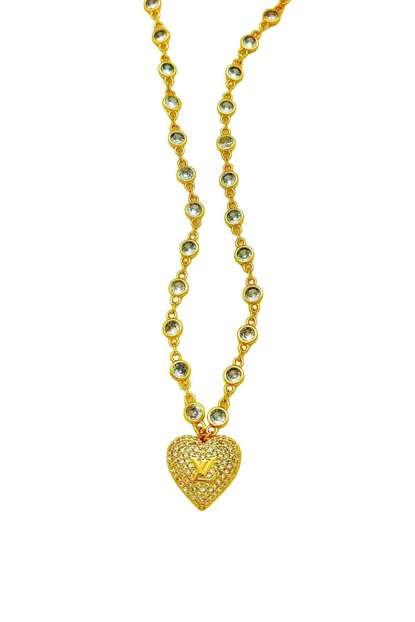 Crystalized LV heart pendant on 17" cz gold chain with magnetic closure and tarnish resistant e-coating. Designer buttons and/or charms are authentic, then repurposed into jewelry. Some pieces are one...