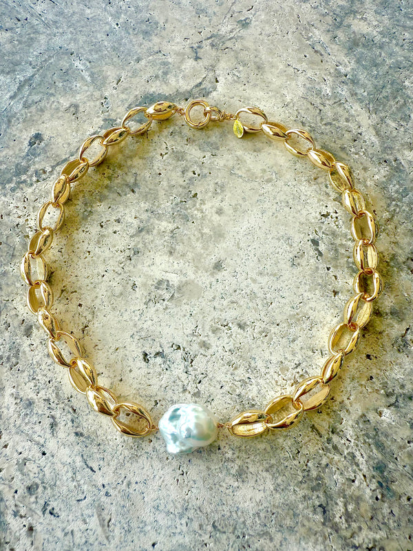 Baroque pearl center in large chunky gold plated chain with special e-coating for tarnish resistance, 17".  Pearls signify innocence and promotes purity and truth.