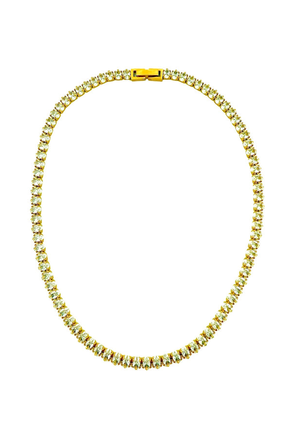 Oval crystals on choker style necklace 14.5". Stainless steel base, nickel and lead free. Tarnish and water resistant. Dress it up or down.