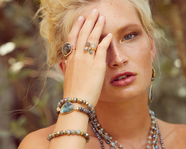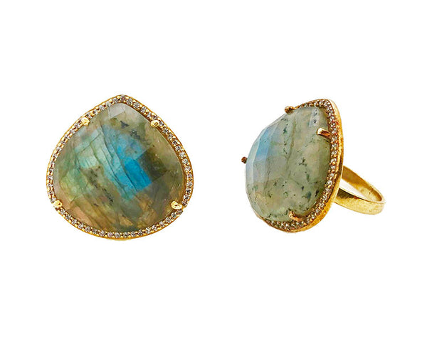 Labradorite teardrop gem with CZ crystals in 22kt vermeil gold adjustable setting, 1".  Labradorite is used for transformation and change, gives balance & strength.