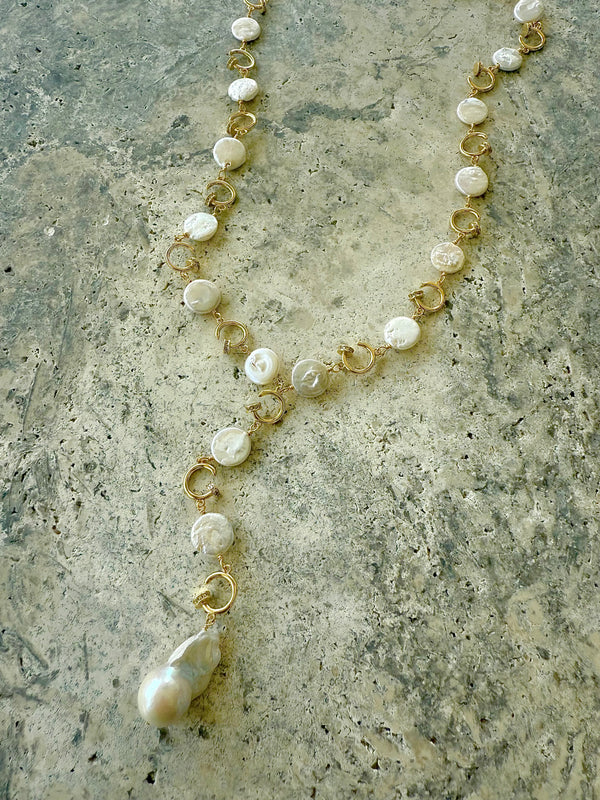 Fresh water pearls in vermeil gold with cz nails. 24" y-style necklace with 4" hang and baroque pearl. Inspired by the 'Juste un Clou' collection.  Pearls signify innocence and promotes...