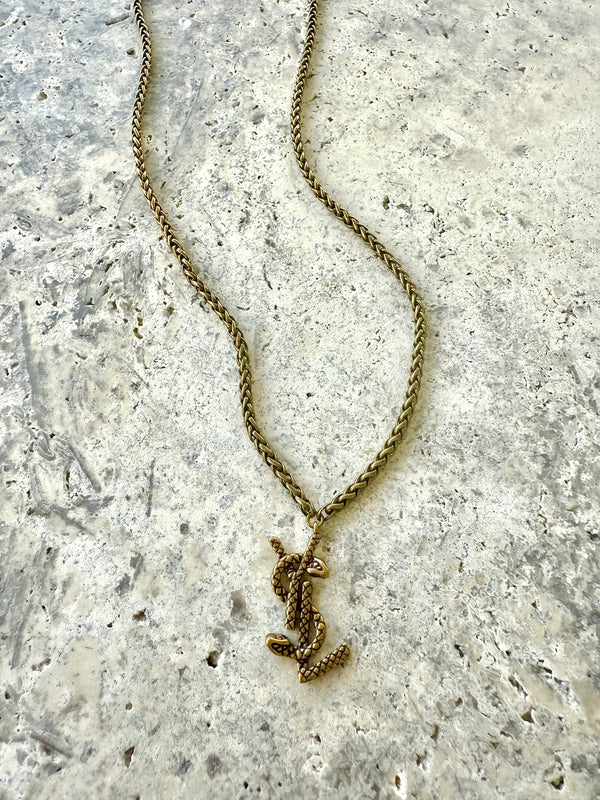 YSL snake charm on antique brass chain, 18" with magnetic closure.   Some are one of a kinds or limited editions. 100% authentic charms, repurposed into necklaces. Trademarks are owned by...